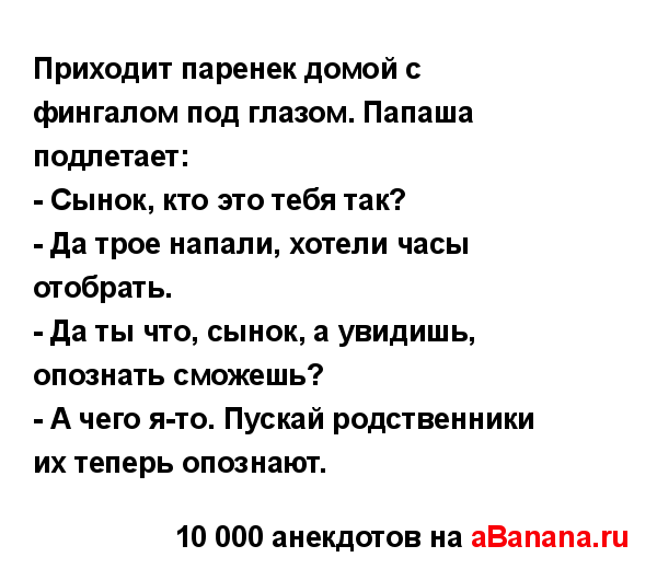 Приходит паренек домой с фингалом под глазом. Папаша...