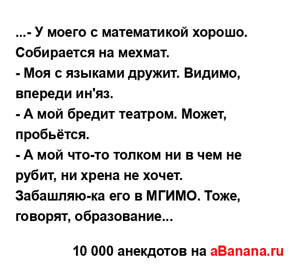 ...- У моего с математикой хорошо. Собирается на мехмат. ...