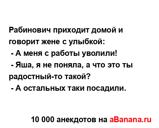Рабинович приходит домой и говорит жене с улыбкой: ...