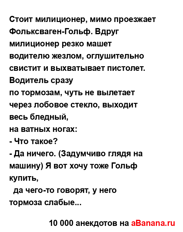 Стоит милиционер, мимо проезжает Фольксваген-Гольф....