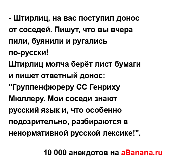- Штирлиц, на вас поступил донос от соседей. Пишут, что...
