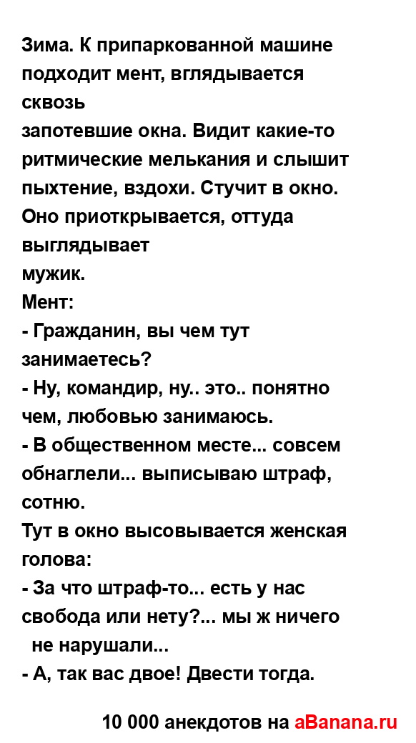 Зима. К припаркованной машине подходит мент,...