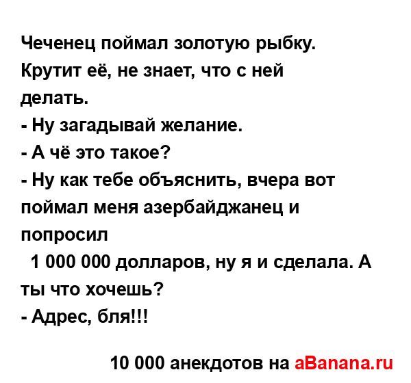 Чеченец поймал золотую рыбку. Крутит её, не знает, что с...