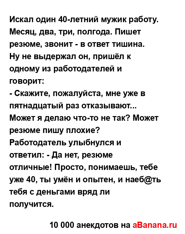Искал один 40-летний мужик работу. Месяц, два, три,...