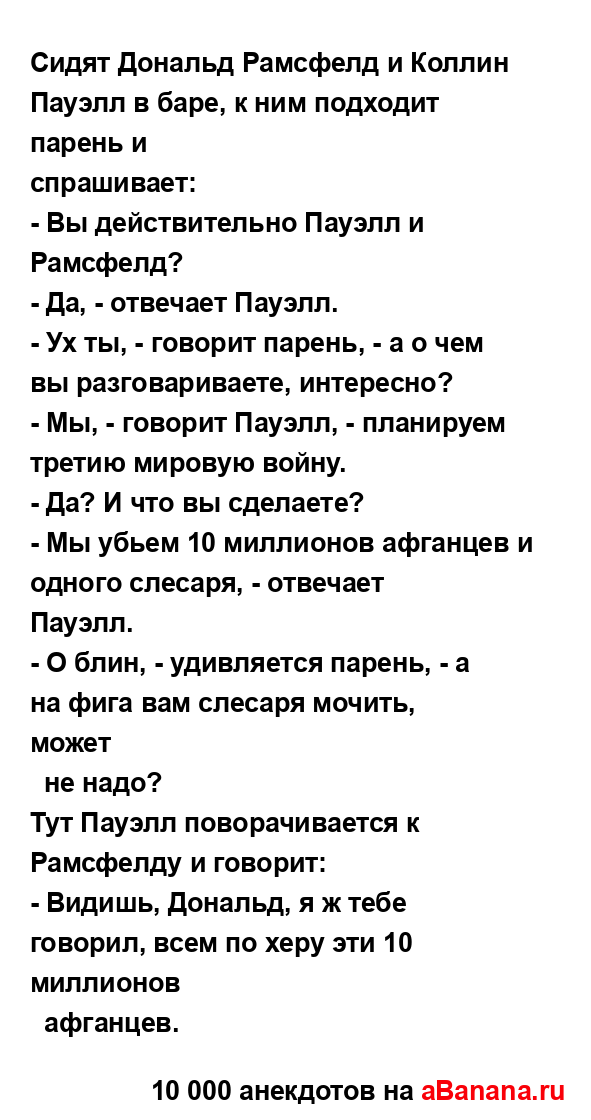 Сидят Дональд Рамсфелд и Коллин Пауэлл в баре, к ним...