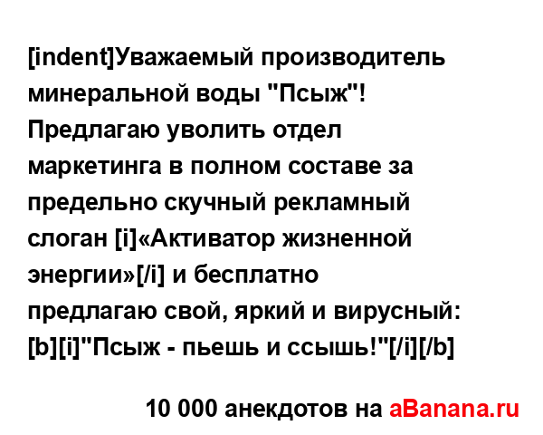 [indent]Уважаемый производитель минеральной воды "Псыж"!...