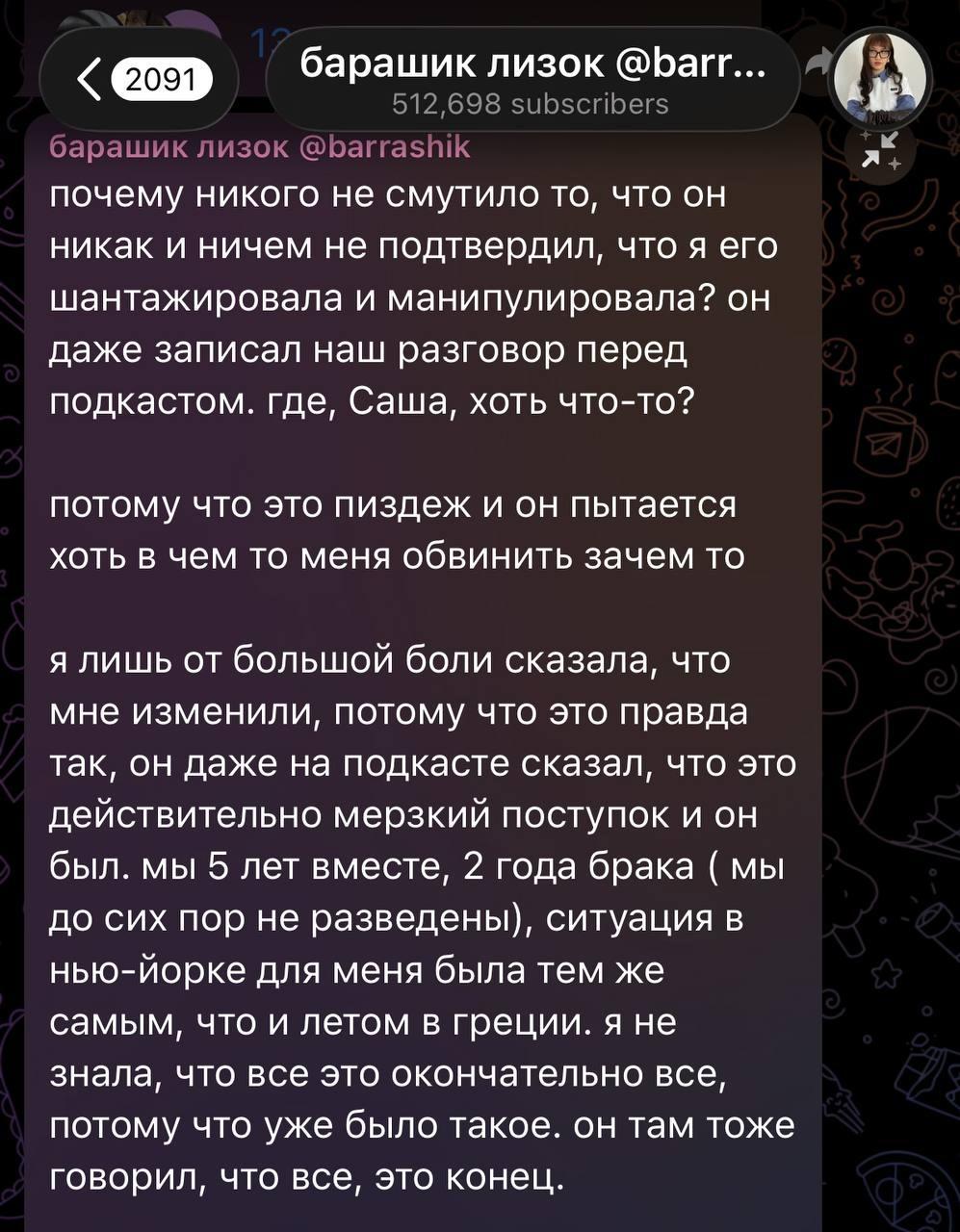 Лиза Барашик также написала пост в тг-канале по ситуации с интервью Теслонда