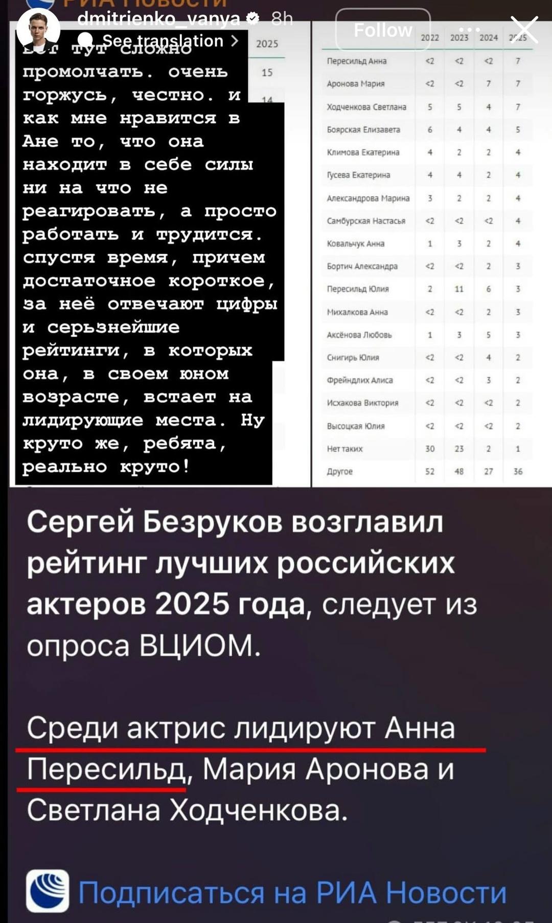 Ваня запостил в своих сториз новость о том, что Аня возглавила список лучших российских актеров 2025. Он также добавил, что гордится Аней и тем, что она находит силы «ни на что не реагировать, а просто работать и трудится».